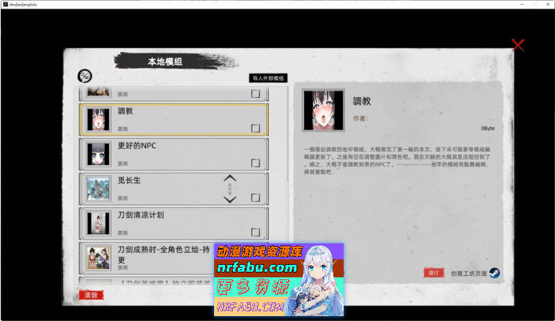 版本为Ver1.0.1.2 整合了大量创意工坊的游戏MOD,成功把武侠游戏变成调教女侠游戏